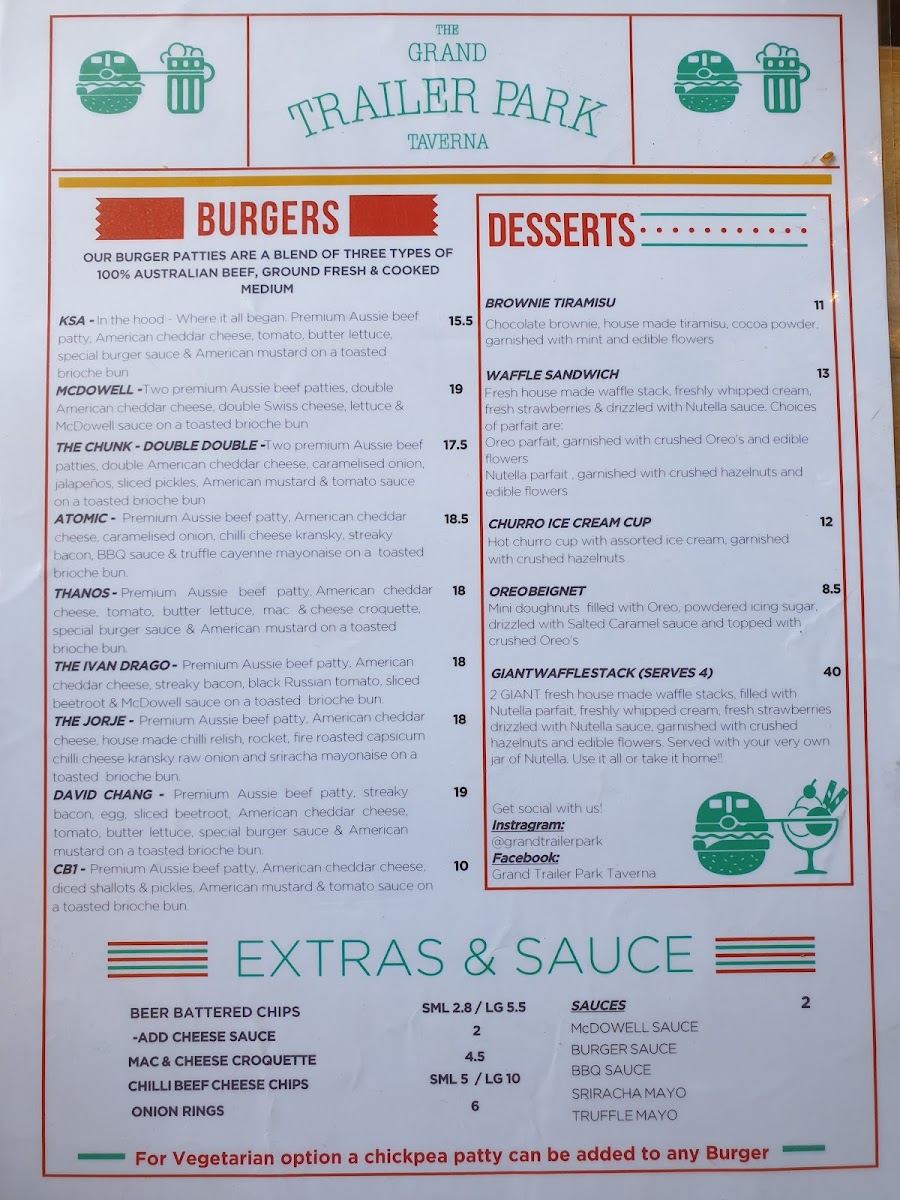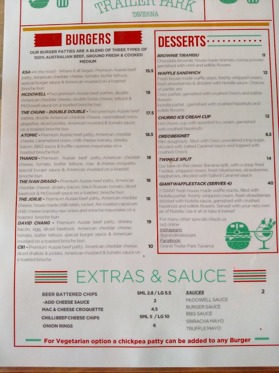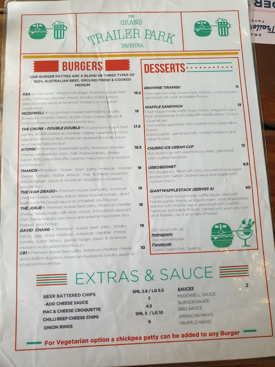 Nestled in the heart of Melbourne at 87 Bourke St, the Grand Trailer Park Taverna is a haven for burger enthusiasts and milkshake aficionados alike. Our menu is bursting with culinary creativity and is designed to delight your taste buds. Start your journey with our legendary Great Burger or spice it up with the Atomic Burger. Indulge in the savory goodness of our Chicken Burger or the unique McDowell Burger, and don't miss out on the Special Goldie Burger for a delightful twist. Pair your meal with our perfectly Battered Fries or Large Chilli Beef Chips for the ultimate comfort food experience. Sweeten your visit with a Salted Caramel Milkshake or our whimsical Kinder Surprise Milkshake, and for something more indulgent, try our Nutella Waffle Sandwich. If you're feeling adventurous, the Apple Pie Cocktail and Alcoholic Float add an exciting touch to your meal. Whether you're celebrating a special occasion or simply treating yourself, the Grand Trailer Park Taverna menu promises an unforgettable dining experience!
