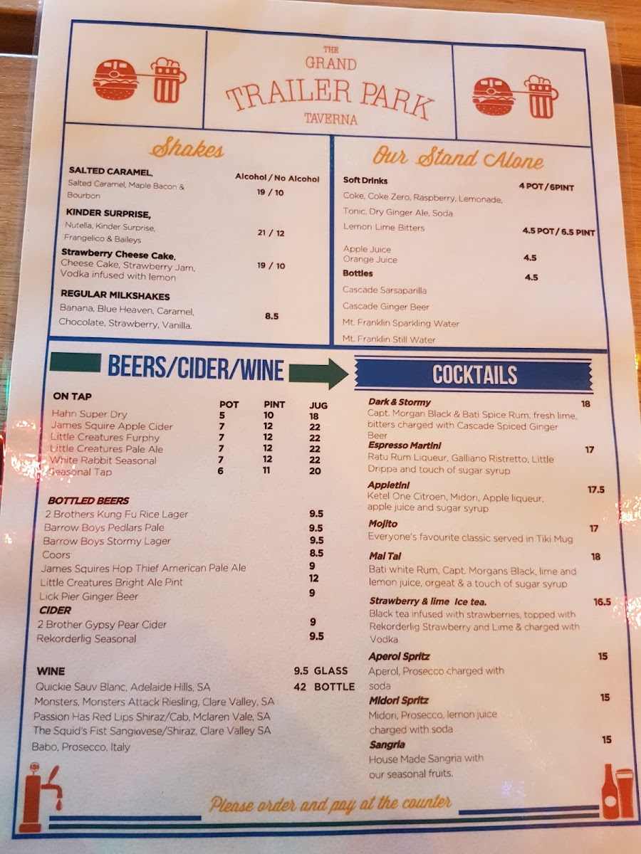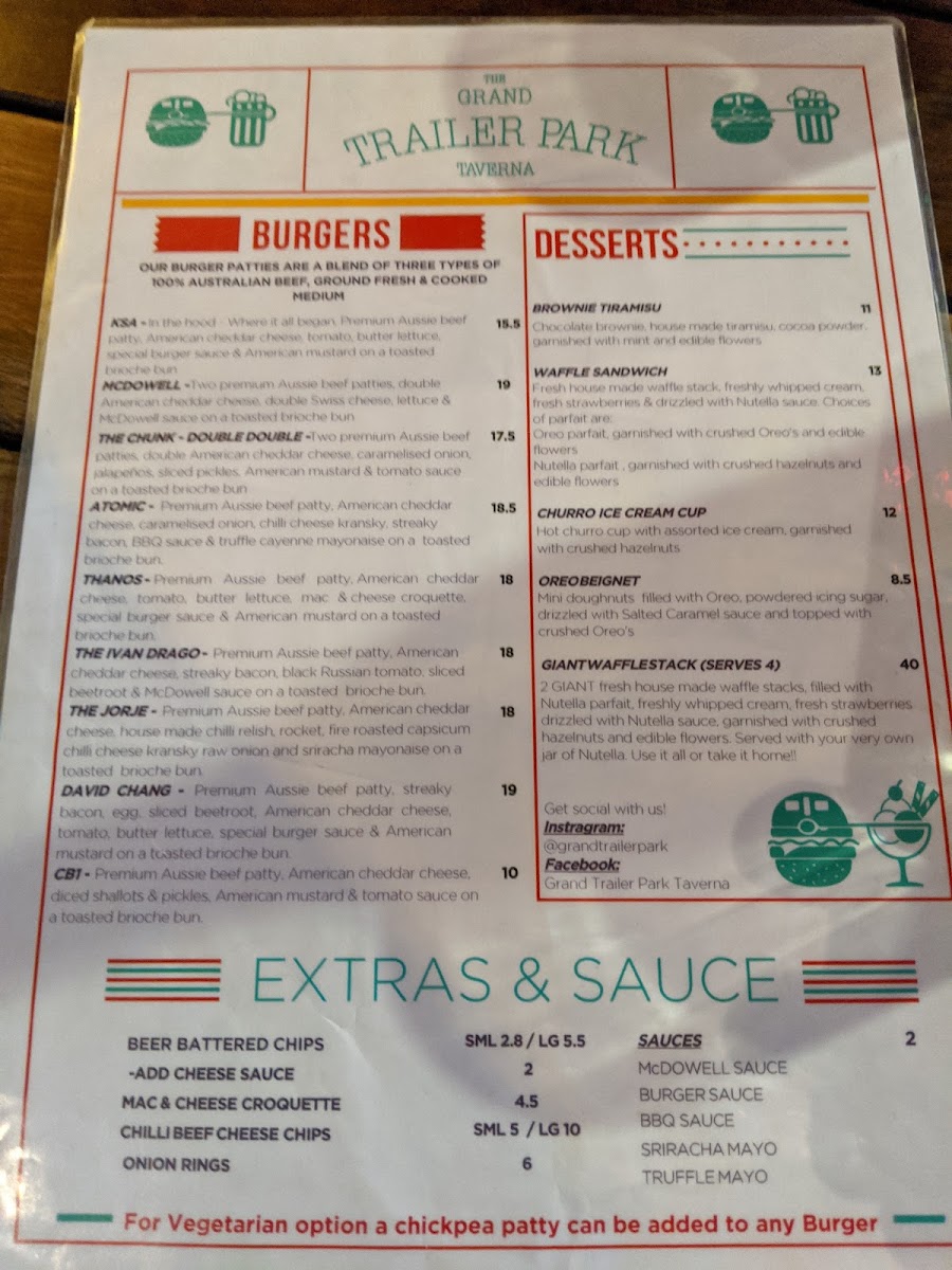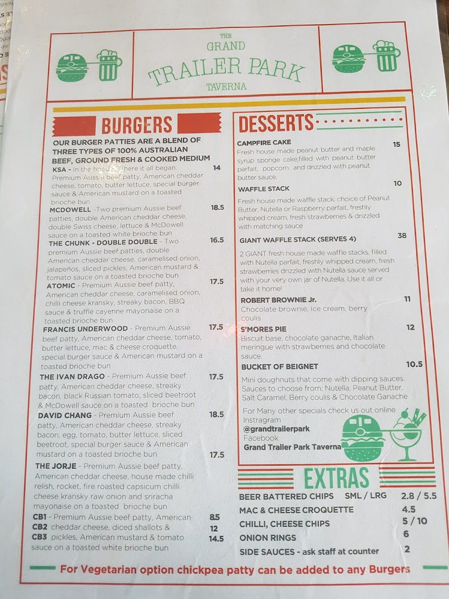 Nestled in the heart of Melbourne at 87 Bourke St, the Grand Trailer Park Taverna is a haven for burger enthusiasts and milkshake aficionados alike. Our menu is bursting with culinary creativity and is designed to delight your taste buds. Start your journey with our legendary Great Burger or spice it up with the Atomic Burger. Indulge in the savory goodness of our Chicken Burger or the unique McDowell Burger, and don't miss out on the Special Goldie Burger for a delightful twist. Pair your meal with our perfectly Battered Fries or Large Chilli Beef Chips for the ultimate comfort food experience. Sweeten your visit with a Salted Caramel Milkshake or our whimsical Kinder Surprise Milkshake, and for something more indulgent, try our Nutella Waffle Sandwich. If you're feeling adventurous, the Apple Pie Cocktail and Alcoholic Float add an exciting touch to your meal. Whether you're celebrating a special occasion or simply treating yourself, the Grand Trailer Park Taverna menu promises an unforgettable dining experience!